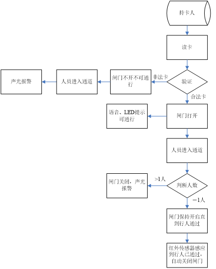 6.若行人不識別進入通道時,閘門不動作禁止行人通行,同時紅外線傳感器感應到有人非法進入通道,閘機聲光告警器鳴響告警(需增加聲光告警器),直至行人退出通道后告警解除,重新讀有效卡方允許通行。